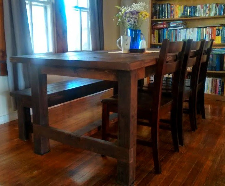 The bench runs the length of the table, and to be honest I don't think I ever want a dinning room table with out one. We sit at the bench far more than any of the chairs. The bench is constructed completely out of 2x4's